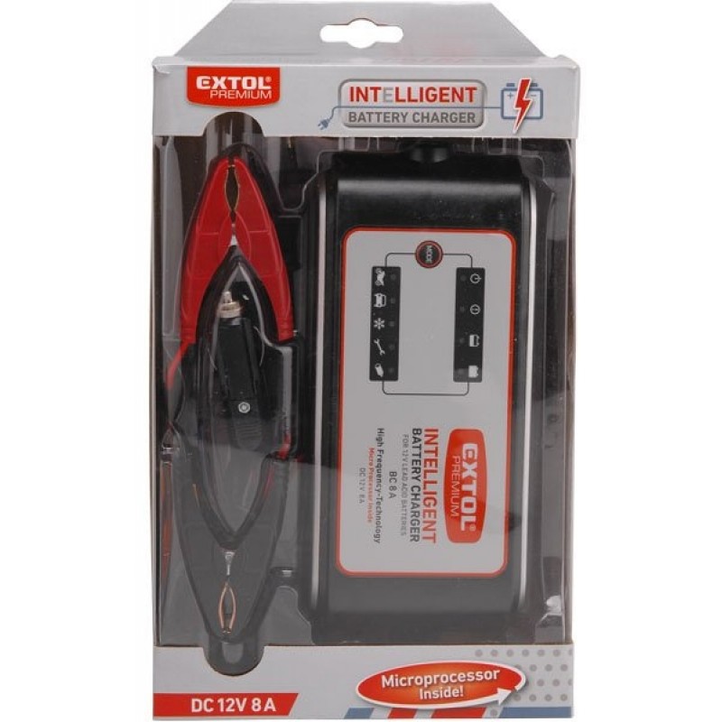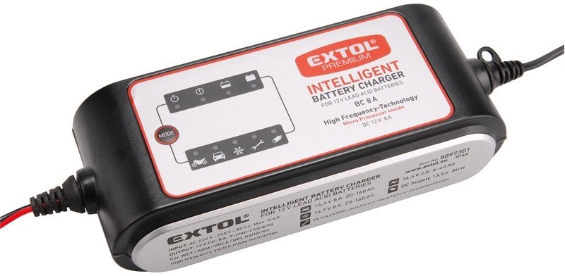 EXTOL PREMIUM autonabíjačka riadená mikroprocesorom, 9stupňová, 12V, 4ANabíjačka je určená pre nabíjanie 12V olovených akumulátorov sa zaplavenú elektródou WET aj Calcium, MF VRLA akumulátorov, AGM, aj gélových v rozsahu menovitej kapacity batérií 6 - 160Ah. Pre svoju prácu využívajú automatický prepínací mód o vysokej frekvencii. Vstavaný mikroprocesor v naprogramovaných deviatich fáz procesu zaistí nabitie batérií až do 100% ich originálne kapacity. Umožňuje automaticky (alebo voliteľne) znovuoživenie čiastočne sulfátovaných batérií. Nabíja a zachraňuje vyčerpanej batérie. V automatickom udržiavacím móde dodáva batériám iba toľko potrebnej energie, ktorá sa rovná jej samovybíjecímu prúdu, takže umožní užívateľovi ponechať batériu spojenú s nabíjačkou aj po niekoľko mesiacov a udržať ju v stále plnom stave nabitia. 9 nabíjacích stupňov - 1-vyhodnotenie stavu batérie, 2-zotavenie batéria, 3-pozvoľné začatí nabíjania, 4-nabíjanie konštantným pulzným prúdom, 5-regenerácia (desulfatácia), 6-nabíjanie konštantným prúdom, 7-znižovanie nabíjacieho prúdu, 8-kontrola stavu, 9-konštantné napätie, udržiavacia pulzný prúd