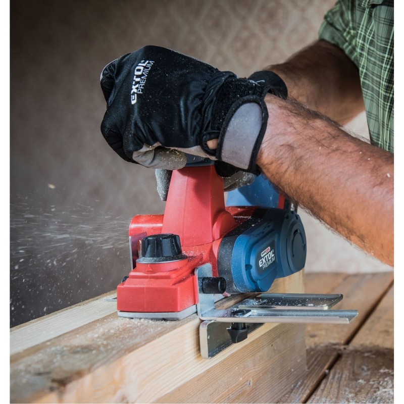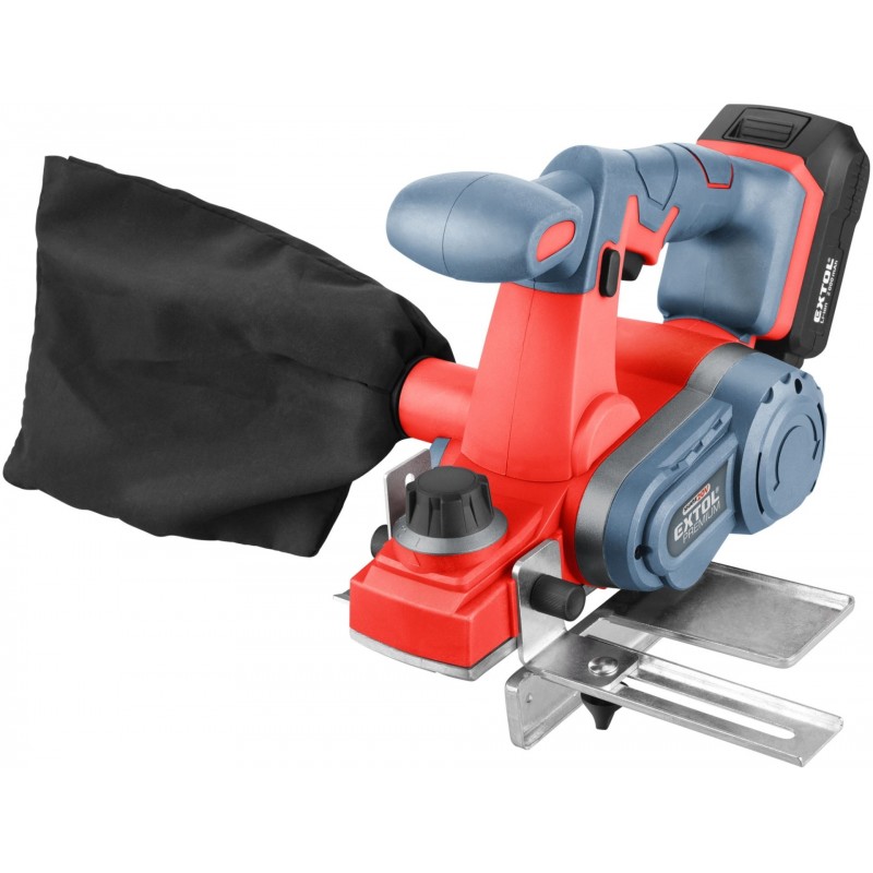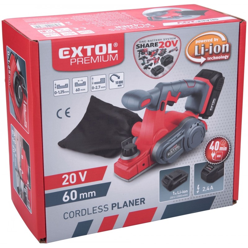 Aku hoblík Extol Premium kombinuje rýchlosť a výkonnosť elektrického hoblíka s pohodlím akumulátorového náradia. Výsledkom je rýchle a presné odobratie materiálu bez prekážajúceho kábla. Rezná hlava hoblíka má dva kvalitné brity. Ochranný tŕň v pracovnej doske hoblíka chráni čepeľ aj obrábaný materiál tým, že udržuje čepeľ zdvihnutú a mimo kontakt s povrchom vášho materiálu medzi rezy. Zberný vak pripojený na prachový výstup pomáha udržiavať pracovný priestor čistý a bez pilín. Priložený adaptér pre falcovanie pomáha vytvárať polodrážky vo vašich doskách a paralelný adaptér udržuje hoblík v nastavenej vzdialenosti. Pre bežnú prácu dostačujú jeden alebo dva 2000mAh akumulátory, ktoré môžete rýchlo nabiť v rýchlonabíjačke, pre náročnejšiu alebo dlhšiu prácu odporúčame väčšie akumulátory s kapacitou 4000mAh. Akumulátor je možné použiť vo všetkých typoch náradia radu EXTOL SHARE20V. Vďaka použitej Li-ion technológii je ho možné kedykoľvek dobíjať bez toho, aby sa tým znižovala jeho kapacita. Li-ion akumulátor stráca energiu vplyvom samovybíjania veľmi pomaly a vydrží dlho nabitý a pripravený na použitie.