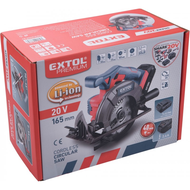 Aku kotúčová píla je navrhnutá tak, aby užívateľom poskytla výkonné a ľahké rezanie pri rôznych inštalatérskych, elektrických, rámovacích, dokončovacích a tesárskych prácach. Píla je poháňaná silným motorom s otáčkami 3650 / min, ktorý umožňuje používateľom rýchlo a ľahko rezať tvrdým materiálom. Horný a spodný kovový ochranný kryt poskytujú vynikajúcu ochranu kotúča pri páde. Gumová mäkká rukoväť je ergonomicky navrhnutá tak, aby užívateľom poskytovala vynikajúce pohodlie a vyváženie pre ľahko ovládateľné rezy. Pre bežnú prácu postačujú jeden alebo dva 2000mAh akumulátory, ktoré môžete rýchlo nabiť v rýchlonabíjačke, pre náročnejších alebo dlhšej práci odporúčame väčšie akumulátory s kapacitou 4000mAh. Akumulátor možno použiť vo všetkých typoch náradia radu EXTOL SHARE20V. Vďaka použitej Li-ion technológii je ho možné kedykoľvek dobíjať, bez toho aby sa tým znižovala jeho kapacita. Li-ion akumulátor stráca energiu vplyvom samovybíjania veľmi pomaly a vydržia dlho nabitý.HLAVNÉ PREDNOSTI