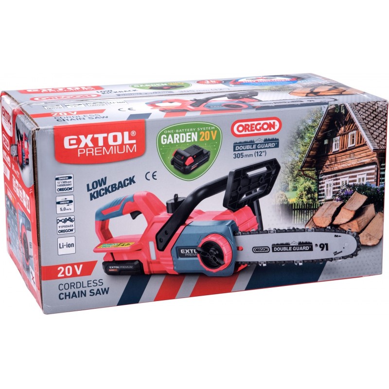 Reťazová aku píla je určená na vykonávanie skracovacích rezov dreva, ako je napr. Rezanie trámov, výrub stromov s primerane silným kmeňom, k odvetvovanie kmeňov, na rezanie kmeňov alebo hrubých konárov na palivové drevo. Aku reťazová píla spája výhody elektrických píl - nízky hluk, jednoduchosť obsluhy a údržby so slobodou pohybu pri benzínových píl. Je vybavená kvalitnú značkovú vodiacou lištou a pílovým reťazou OREGON®. Pílová lišta má patentovanú technológiu Double Guard ® s funkciou obmedzenia spätného vrhu "Low kickback". Prefíkaní reťaze za chodu je automaticky zaisťované čerpadlom. Píla je tiež vybavená systémom pre jednoduchú a rýchlu výmenu reťaze a mechanizmom pre jednoduché vypnutie reťaze. Stroj je vybavený bezpečnostnou poistkou, ktorá sa aktivuje pri vykĺznutiu z rúk alebo pri "kopnutie" píly a elektronickú dobehovou brzdou, ktorá zaistí jeho rýchle zastavenie. Pogumovaná rukoväť bráni vyšmyknutiu, tlmí vibrácie a spríjemňuje držanie pri práci.