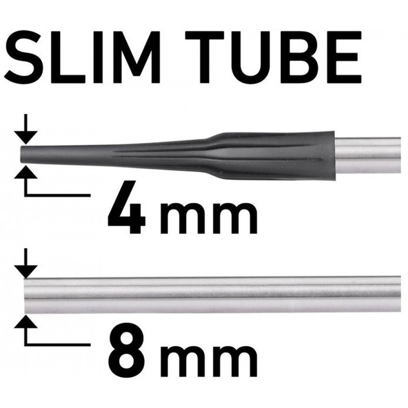 - najužšia 8mm úzka oceľová trubica, ktorá znesie hrubé zaobchádzanie (odstránenie zvyšku peny nožom, atď.)- na trubicu možno navyše nasadiť dodávanú plastovú špičku, ktorá ústi do vonkajšieho priemeru 4mm a preto je pištoľ vhodná pre aplikáciu peny do úzkych priestorov, dier a štrbín "