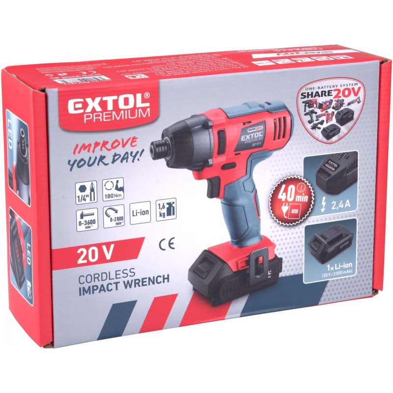 Ľahký a výkonný rázový aku uťahovák s max. Krútiacim momentom 180N Vám poskytuje výkon, ktorý potrebujete pri uťahovanie a povoľovanie skrutiek. Rázový moment zvyšuje silu uťahovača pri skrutkovaní a zároveň znižuje spotrebu batérie pri uťahovaní. Preto je uťahovák pri skrutkovaní oveľa efektívnejšie ako aku vŕtačka a tiež zaskrutkuje viac skrutiek na jedno nabitie batérie. Dotiahnutie vrutu uľahčuje automatické zníženie rýchlosti pri zvýšení odporu a trenia dotahovaného vrutu. Hlava sa šesťhranným úchytom je vybavená zámkom pre bity a držiaky bitov s drážkou. Celokovová prevodovka zabezpečuje bezchybný chod pri i vysokej záťaži a prispieva k lepšiemu odvodu tepla vznikajúceho pri práci. Uťahovák je vybavený LED svietidlom, ktorá osvetľuje pracovný priestor pri práci. Vďaka nízkej hmotnosti 1,6 kg s batériou možno uťahovák používať aj pri dlhších prácach. Pre bežnú prácu postačujú jeden alebo dva 2000mAh akumulátory, ktoré môžete rýchlo nabiť v rýchlonabíjačke, pre náročnejších alebo dlhšej práci odporúčame väčšie akumulátory s kapacitou 4000mAh. Akumulátor má indikátor nabitia a možno použiť vo všetkých typoch náradia radu EXTOL SHARE20V. Vďaka použitej Li-ion technológii je ho možné kedykoľvek dobíjať, bez toho aby sa tým znižovala jeho kapacita. Li-ion akumulátor stráca energiu vplyvom samovybíjania veľmi pomaly a vydrží dlho nabitý a pripravený na použitie.