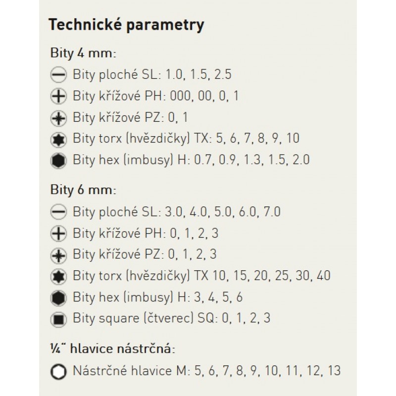 • Bity hex (imbusy) H: 0.7, 0.9, 1.3, 1.5, 2.0