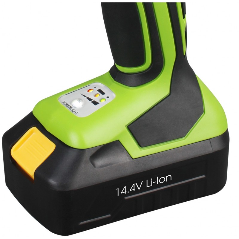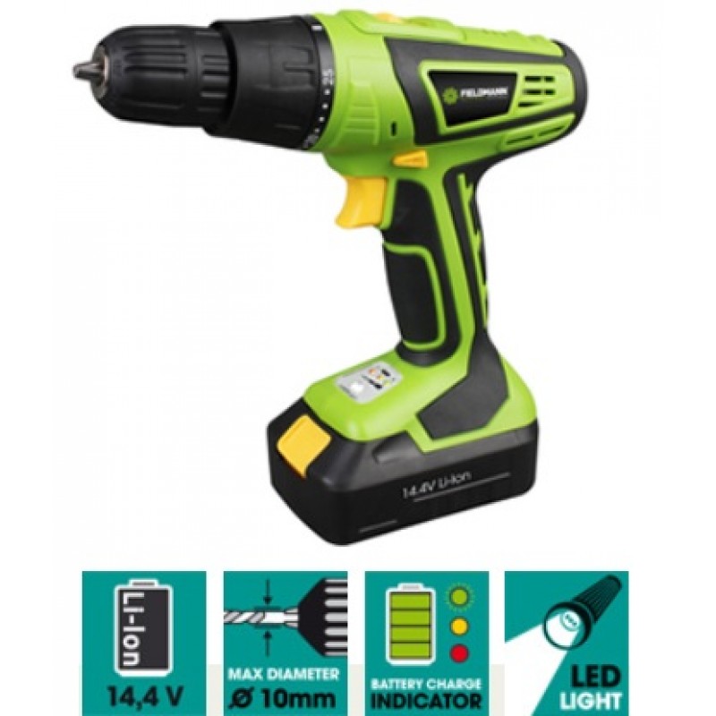 Pri práci s akumulátorovú vŕtačkou Fieldmann pohodlne dosiahnete kamkoľvek, nie ste nijako obmedzení dĺžkou prívodného kábla, pretože chod zabezpečuje Li-Ion batéria 14,4 V.