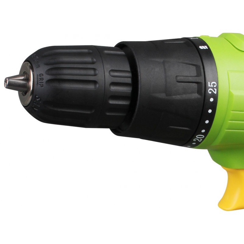 Vŕtačka je aj s batériou veľmi ľahká a vyvážená, navyše je vybavená pohodlnou ergonomickou rukoväťou. Vŕtačka má rýchloupínacie skľučovadlo do 10 mm, 2 rýchlosti a 25 + 1 stupňov krútiacich momentov, ktoré sú praktickým pomocníkom pri skrutkovaní a doťahovanie rôznych skrutiek.