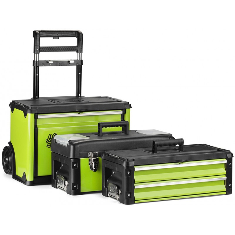 • Všetky tri boxy sú opatrené vyklápacími madlami, aby ich bolo možné prenášať aj jednotlivo. Každý z nich je po stranách vybavený aj masívnymi prackami, ktorými sa medzi sebou vzájomne prepoja v jeden pevný celok, aby bola zaistená stabilita aj bezpečnosť celej sady pri prevážaní. Robustný teleskopické madlo poslúži pri prevoze, pri manipulácii s jednotlivými časťami ale nebude prekážať. Kolieska z tvrdeného plastu zaručujú dlhú životnosť celého boxu.