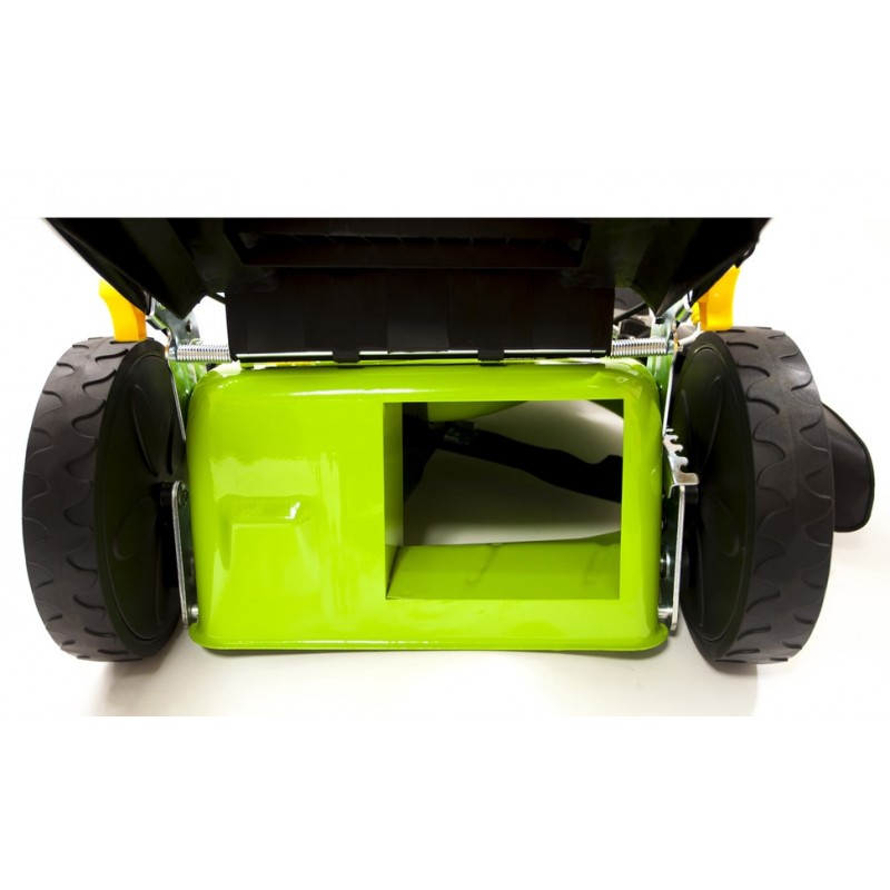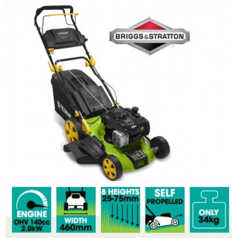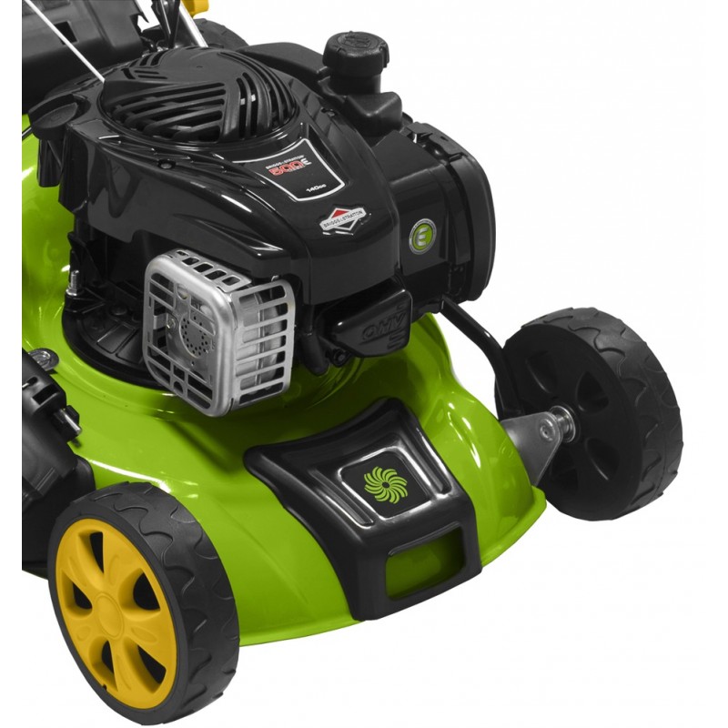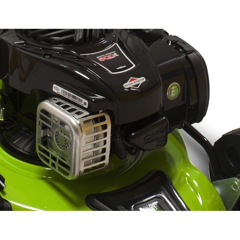 Pre tento model bol vybraný motor od svetoznámeho výrobcu Briggs & Stratton. Jedná sa o model E-Series, ktorý má o 25% nižšie emisie ako požadujú európske normy. Oceľové šasi kosačky má záber 460 mm a je vybavené systémom kosenia 4 v 1. Výšku kosenia je možné nastaviť centrálne. Delený kôš má objem 60 litrov. Veľké zadné kolesá zlepšujú priestupnosť terénom. Výškovo nastaviteľné madlo je opatrené praktickým držiakom na nápoje a drobnosti. V prednej časti kosačky nájdeme madlo, ktoré uľahčuje manipuláciu s kosačkou pri čistení. Samozrejmosťou sú guličkové ložiská všetkých kolies. Odporučená plocha sekania pre tento model je 1 200 m2. .
