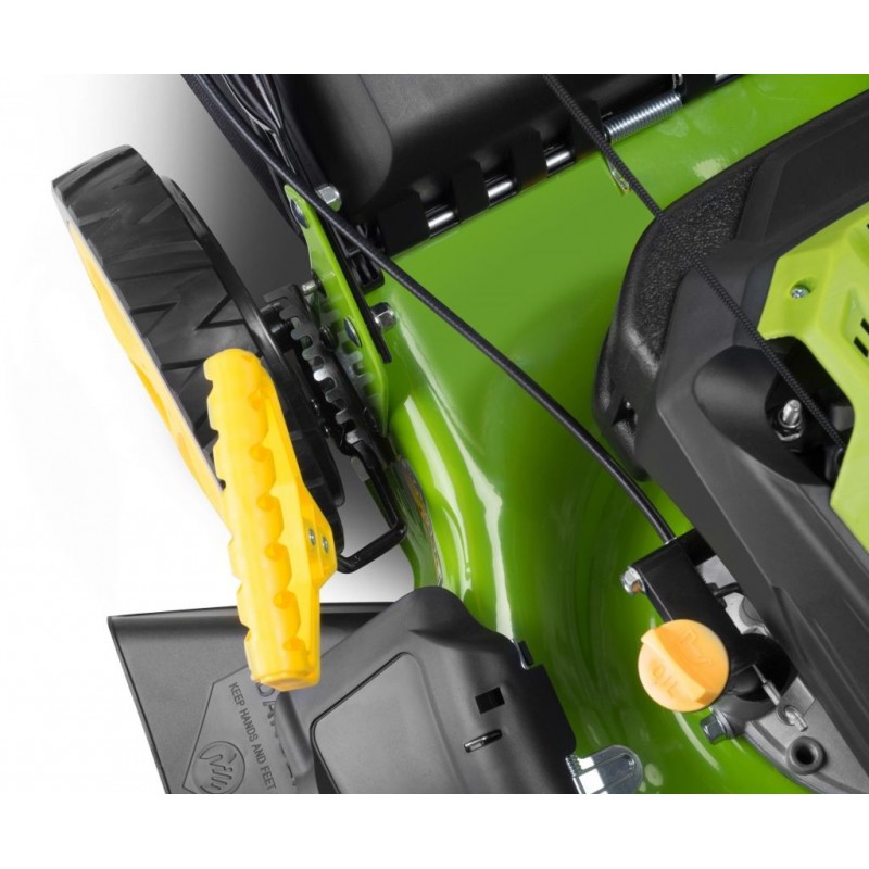 Tento model je vybavený variátorom, ktorý umožňuje nastavenie rýchlosti jazdy. Túto vlastnosť oceníte, najmä keď tráva prerastie, prípadne vyhovuje ak vám pri kosení nižšiu či vyššiu rýchlosť chôdze. Vyberať môžete zo 4 rýchlostí. Zmena rýchlosti jazdy nemá vplyv na otáčky noža. Kosačka je poháňaná prevereným motorom Briggs & Stratton 500 Series. Výška kosenia sa vykonáva centrálne jednou pákou. Využívať môžete aj systém 4 v 1, ktorý vám umožní okrem zberu a mulčovanie, trávu vyřádkovat za kosačkou alebo ju odhodiť do boku. Predný ochranný rám poslúži aj ako madlo, za ktoré zle kosačku držať pri čistení. Kolesá sú uložené na guličkových ložiskách. Odporučená plocha sekania je 1 200 m2.