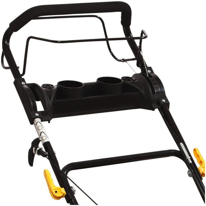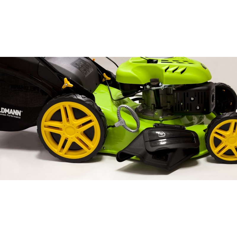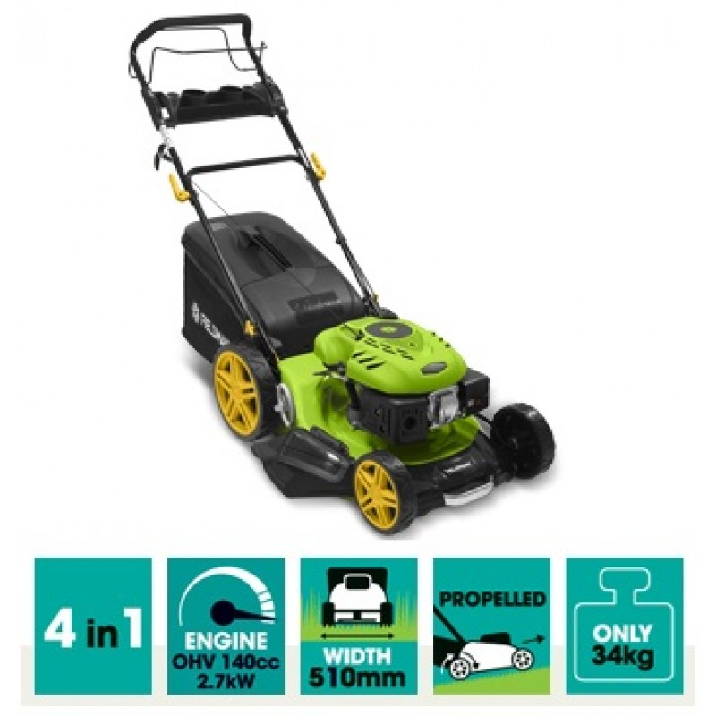 Motor s výkonom 140 cm3, vlastné pojazd a záber kosenia 510 mm predurčujú túto kosačku pre prácu na väčších trávnatých plochách. Oceľové šasi je ďalej vybavené systémom 4 v 1, ktorý umožňuje voliť, ako naložiť s pokosenou trávou (zber, mulčovanie, bočné a zadné odhod). Držadlo tejto kosačky možno úplne sklopiť a minimalizovať tak nároky na skladovanie. Zvoliť môžete tiež jednu z dvoch nastaviteľných výšok madlá. Horný diel madla je potiahnutý penovým poťahom, ktorý tlmí vibrácie. Výška kosenia sa nastavuje centrálne v 6 úrovniach, delený kôš s ukazovateľom zaplnenia má objem 65 l. Všetky kolesá kosačky sú uložené na guličkových ložiskách. V prednej časti je kosačka vybavená hliníkovým madlom, pre ľahšiu manipuláciu pri čistení. Odporučená plocha sekania predstavuje 1 800 m2.