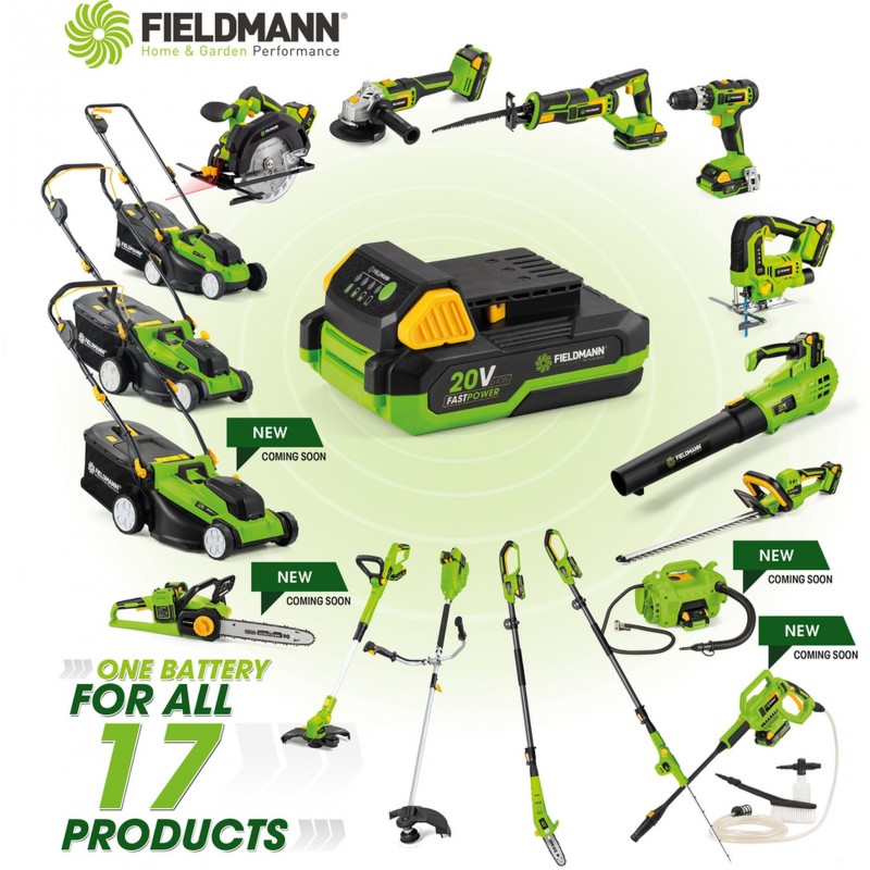 Najvyšší model akumulátorovej kosačky na trávu značky FIELDMANN si poradí s každou záhradou do rozlohy 750 m2. Je vybavená moderným bezuhlíkovým motorom s dlhou životnosťou a nulovými nárokmi na údržbu. Bezpečnostný spínač bráni náhodnému zapnutiu čepele a robustná konštrukcia z odolného plastu je zárukou dlhej životnosti. Pre perfektnú manipuláciu so strojom je kosačka osadená robustnými kolieskami z odolného plastu. Kosačka dosahuje vysoký výkon vďaka plnému využitiu sily 2x 20V akumulátorov v spojení s elektronickou riadiacou jednotkou. Je možné použiť akumulátory s kapacitou 2Ah/4Ah ktoré sú kompatibilné do všetkých výrobkov spoločnosti FIELDMANN rady FAST POWER 20V.