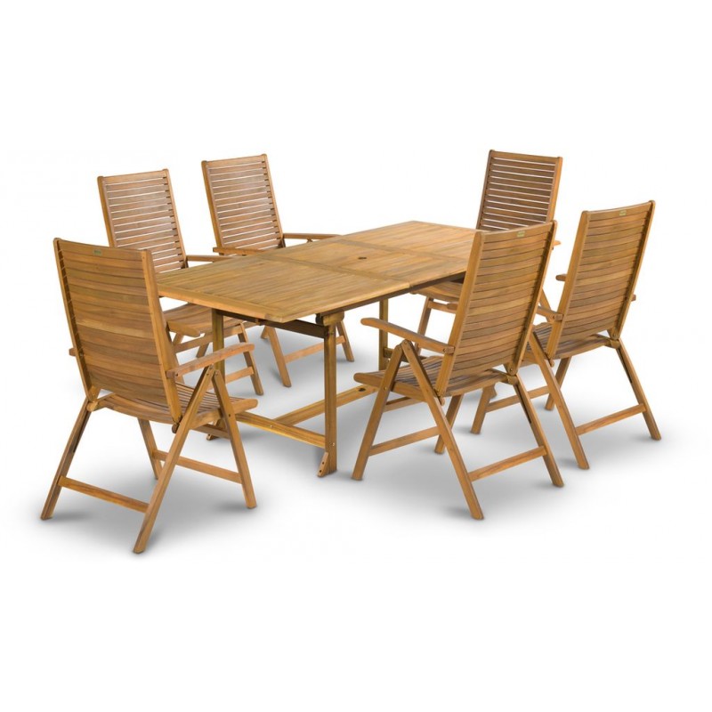 Ak hľadáte naozaj komfortné nábytok a nechcete pritom zľaviť z krásneho vzhľadu a kvalitného spracovania, vyberte nový záhradný set ARIA. Vďaka použitému materiálu, drevu akácie, vyniká vysokou odolnosťou voči poveternostným vplyvom, starnutiu, ale aj plesniam, hubám a drevokaznému hmyzu. Stabilný rozkladací stôl obdĺžnikového tvaru s rozmermi 150 x 90 cm je možné pre väčšiu spoločnosť rozložiť až na dĺžku 200 cm. Pre ochranu klientov pred ostrým slnkom môžete do otvoru v strede stola umiestniť slnečník. Veľmi pohodlné kreslá majú ergonomicky tvarované chrbtovej opierky polohovateľné do 5 stupňov. Dovybaviť je možné ešte špeciálnymi sedáky v bielej alebo zelenej farbe, ktoré sú vyrobené tak, aby zodpovedali rozmerom a tvaru kresiel.