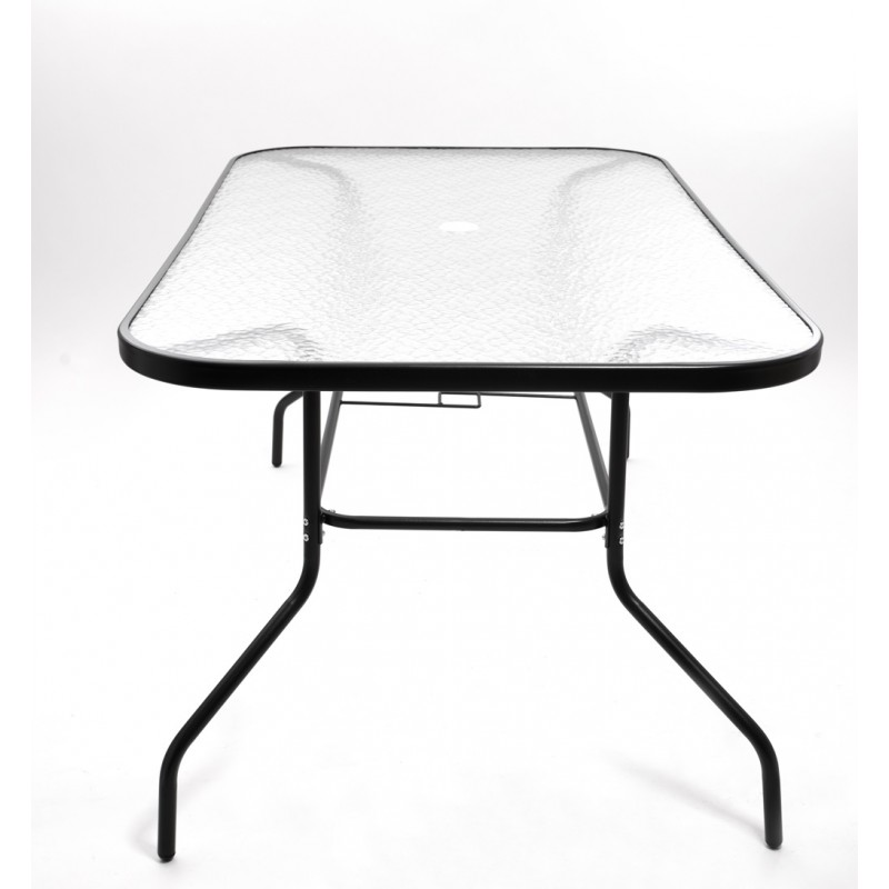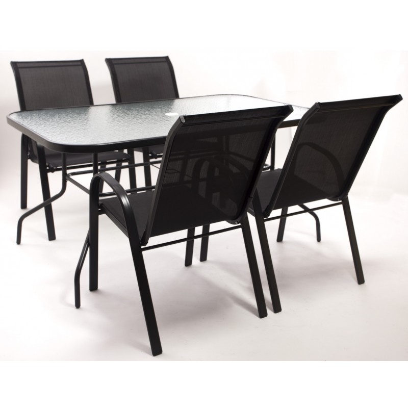 Kvalitné a cenovo dostupná zostava záhradného nábytku. Set je zložený zo stola s čírou doskou o rozmere 150 x 93x 71 cm a štyroch kresiel 55 x 73 x 91 cm. Doska stola je vyrobená z tvrdeného skla a v jej strede je otvor pre slnečník. Výplň kresiel z pružnej syntetickej textílie zvyšuje pohodlie. Tento nábytok je úplne bezúdržbový a je ideálnou voľbou pre vonkajšie použitie.