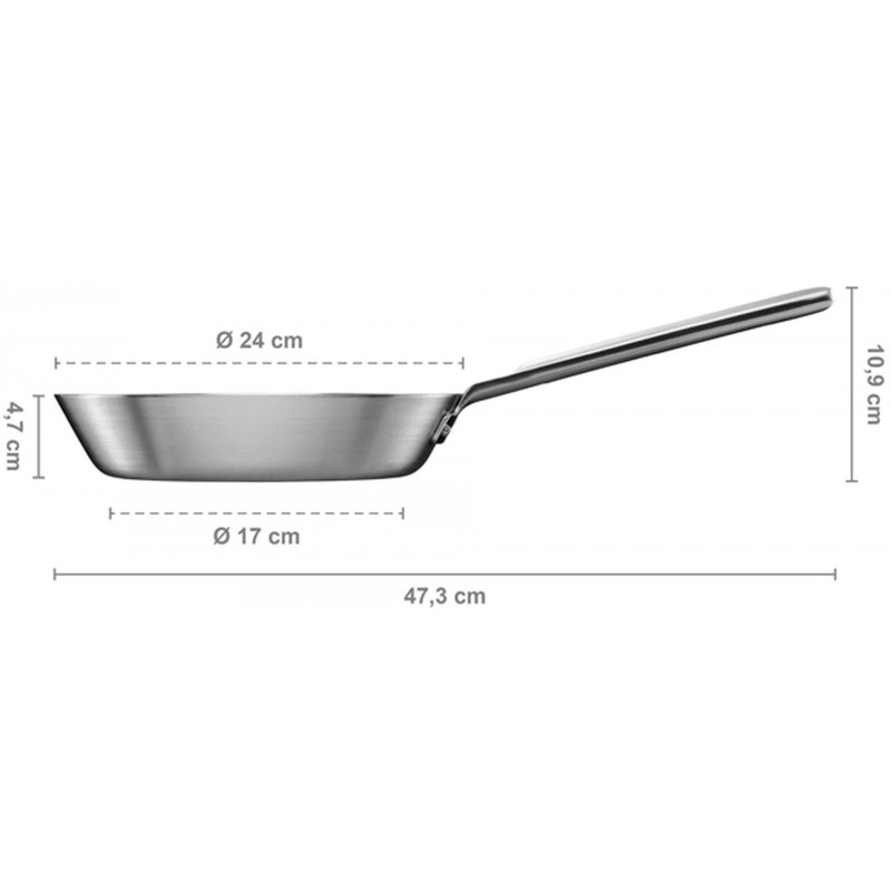 - Viacvrstvová konštrukcia - panvica má 3,5 mm hrubé dno s hliníkovým jadrom medzi vrstvami z nehrdzavejúcej ocele, čo zabezpečuje rovnomerné rozloženie tepla po celom povrchu.