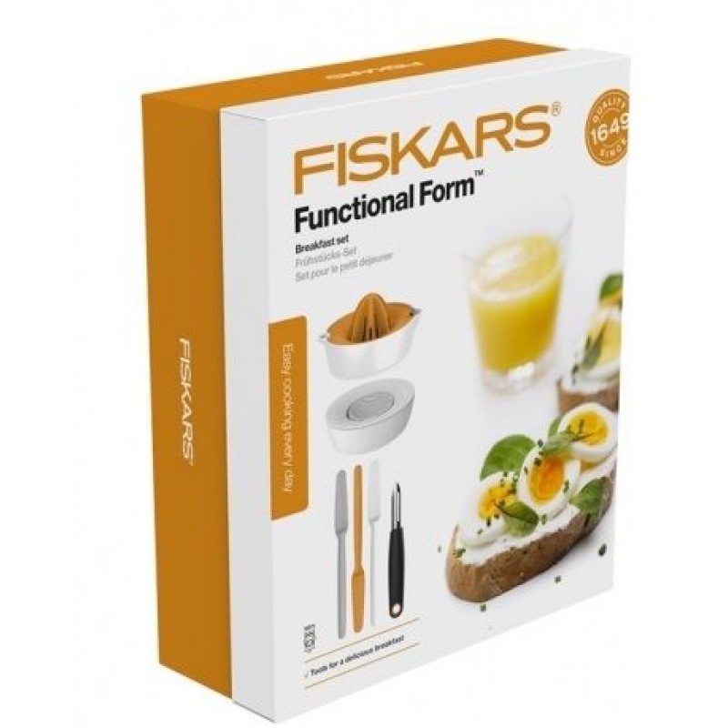 Fantastická raňajková sada Fiskars vhodná do každej kuchyne, či už do bytu či na chalúpku. Sada obsahuje kvalitné kuchynské náčinie - škrabku, nože, lis na ovocie a krájač vajíčok.Krájač na vajcia Fiskars Functional Form (1016126):