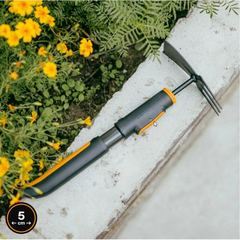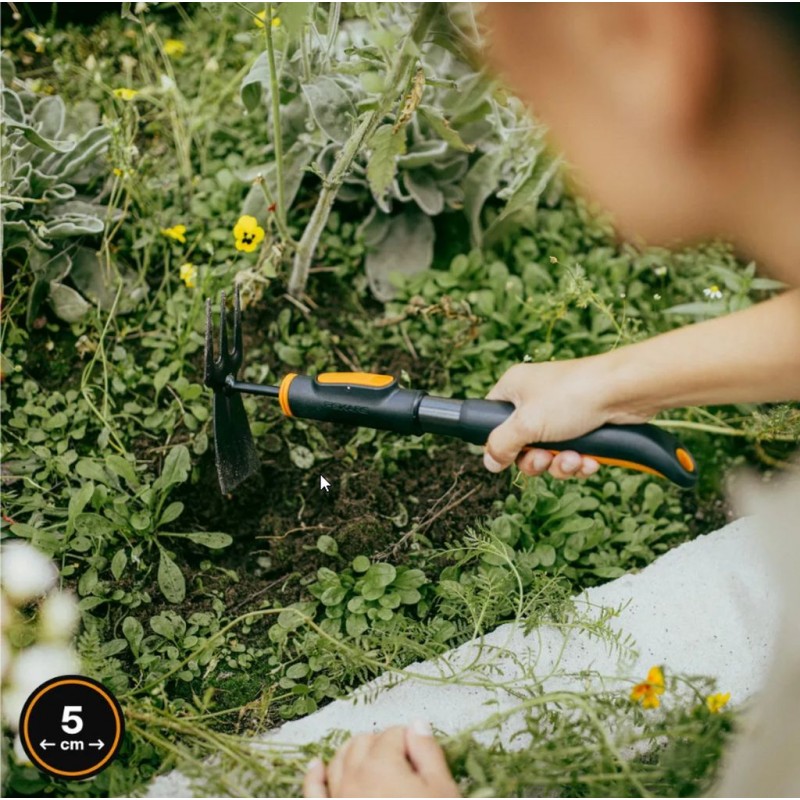 Fiskars OneClick obojstranná motyčka je všestranné záhradné náradie určené na kyprenie pôdy aj odstraňovanie buriny bez nutnosti výmeny nástroja. Kombinácia plochej čepele na presné odrezanie buriny a dvojhrotu na prevzdušnenie zhutnenej pôdy umožňuje efektívnu prácu aj v úzkych riadkoch medzi rastlinami.