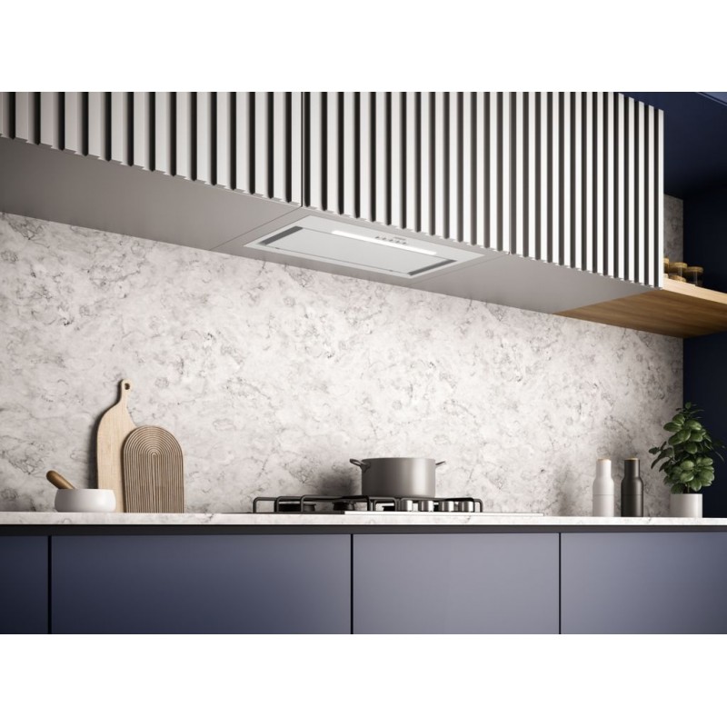 Vstavaný odsávač pár Box Flush Evo. Prevedenie matná biela (NCS S 0500-N). Energetická trieda B. Tlačidlové ovládanie. Štrbinové odsávanie. 3 Stupne výkonu. Intenzívny stupeň.