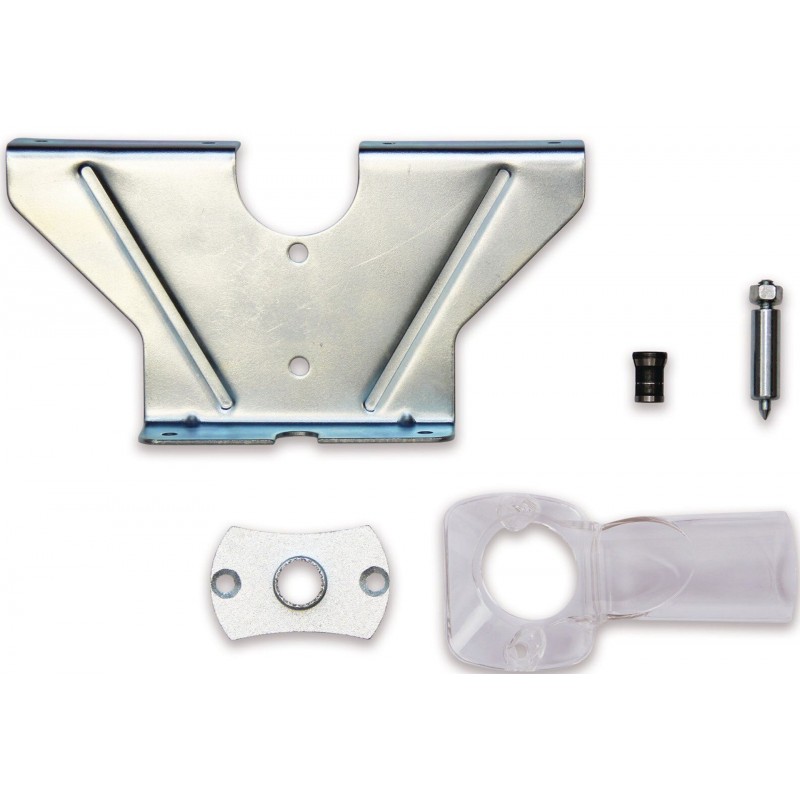 Dodávka zahŕňa klieštiny (6 a 8 mm), paralelný doraz, strediaci tŕň, kopírovací krúžok a náradie na výmenu frézy.
