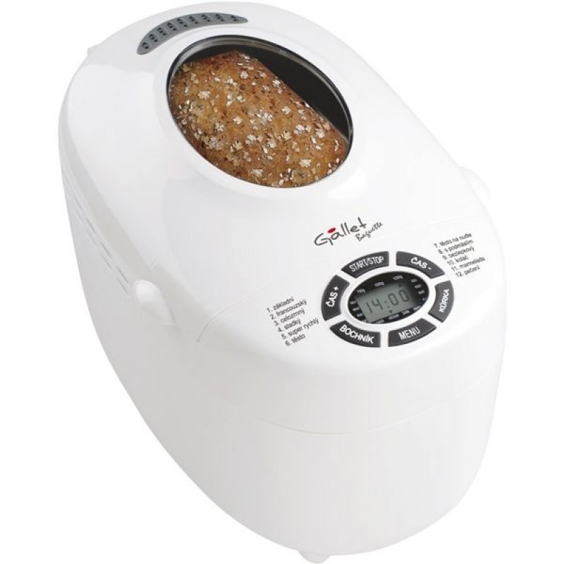 S pekárňou chleba Gallet MAP 205 Baguette stlašte čudlík a za pár hodín sa vám celý byt prevonia vôňou čerstvého chleba. Celkom 12 predvolených programov pre pečenie rôznych druhov chleba, prípravu ciest či marmelády. Vyberiete si z troch veľkostí bochníkov a tiež z troch stupňov sfarbenia kôrky.