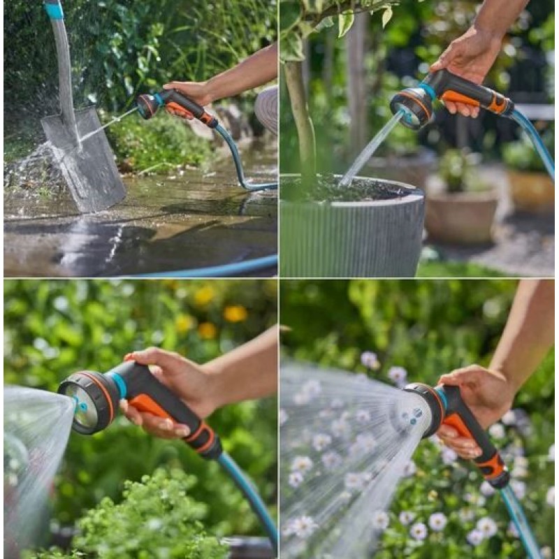 Sprcha umožňuje výber medzi kužeľovým prúdom pre citlivé rastliny, silným prúdom na čistenie, objemovým prúdom vhodným pre črepníkové rastliny a jemným postrekom na rovnomerné zavlažovanie kvetinových a zeleninových záhonov. Prepínanie medzi jednotlivými režimami je rýchle a jednoduché.