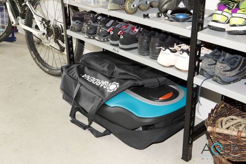 - Pre príslušenstvo sú určené dve postranné vrecká.- Mimo sezónu možno robotickú kosačku a nabíjaciu stanicu skladovať v praktickom kryte.