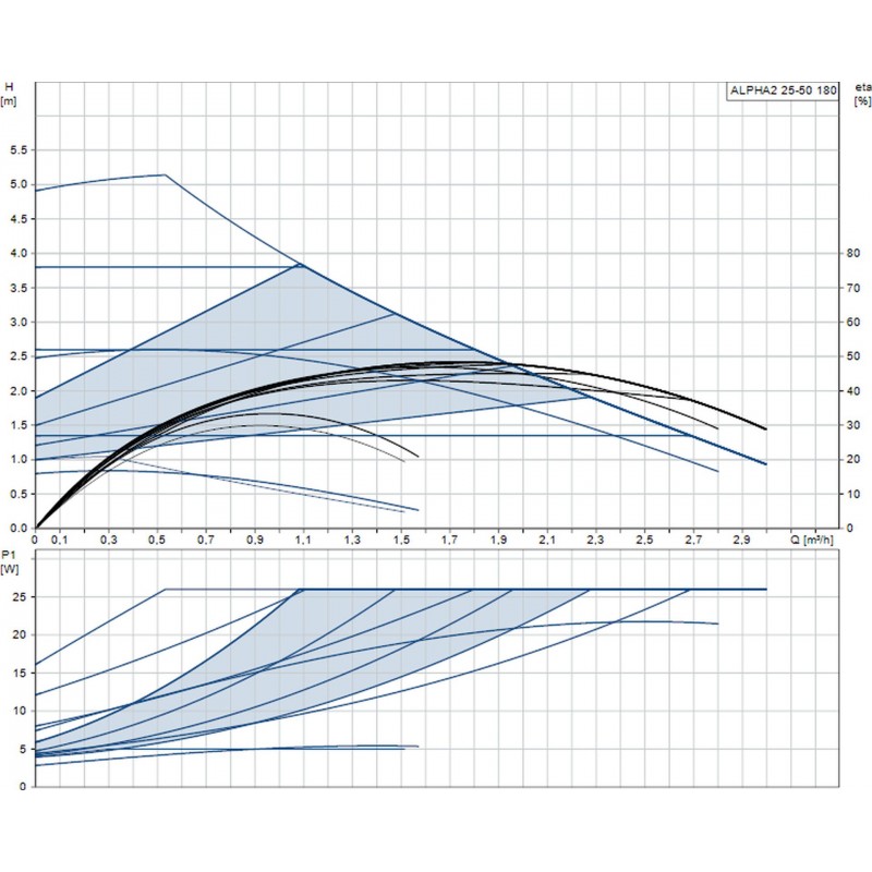Obehové čerpadlo Grundfos ALPHA2 25-50 180 je vysoko účinné elektronicky riadené čerpadlo určené pre vykurovacie systémy a cirkuláciu teplej vody. Vyznačuje sa nízkou spotrebou energie, tichou prevádzkou a automatickým prispôsobením výkonu aktuálnym prevádzkovým podmienkam.