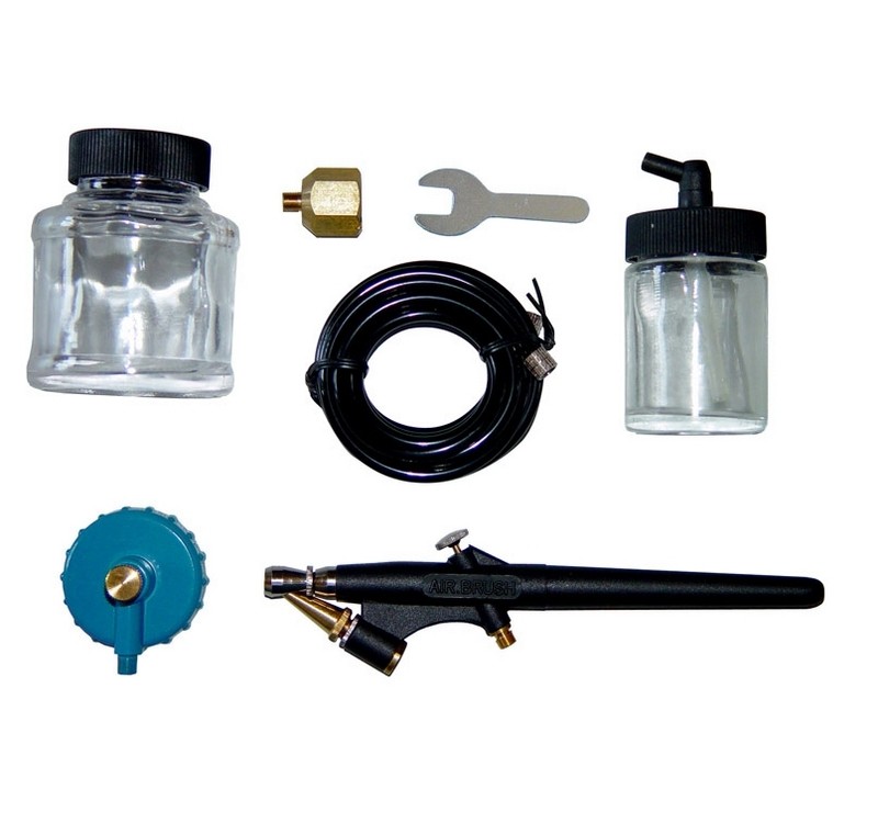 Súprava hobby striekacie pištole pre airbrush s príslušenstvom, určená predovšetkým kutilom na striekanie nápisov, obrázkov, modelov atď atramenty aj farbami (vodovými / zriedenými akrylátovými / olejovými / riedkymi emailovými).