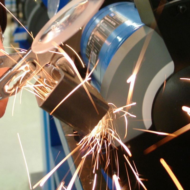 Konštrukcia: robustná kovová skriňa, polohovateľné pracovné opierky, ochranné kryty proti iskrám, základová časť s otvormi (4) pre montáž napevno.