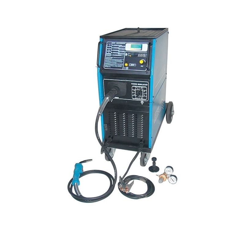 Pojazdný dielenský zvárací agregát riadený mikroprocesorom, s digitálnym displayom, 8-stupňovým prepínaním zváracieho prúdu a plynulou reguláciou podávania drôtu, určený pre zváranie v ochrannej atmosfére drôty O 0,6-1,0 mm (0,6-0,8 mm oceľ / 0,8 mm nerez / 0,8-1,0 mm hliník, spájkovacia drôt / cievky 5-15 kg).