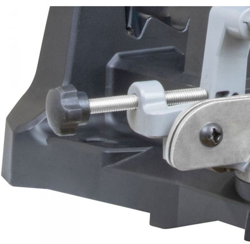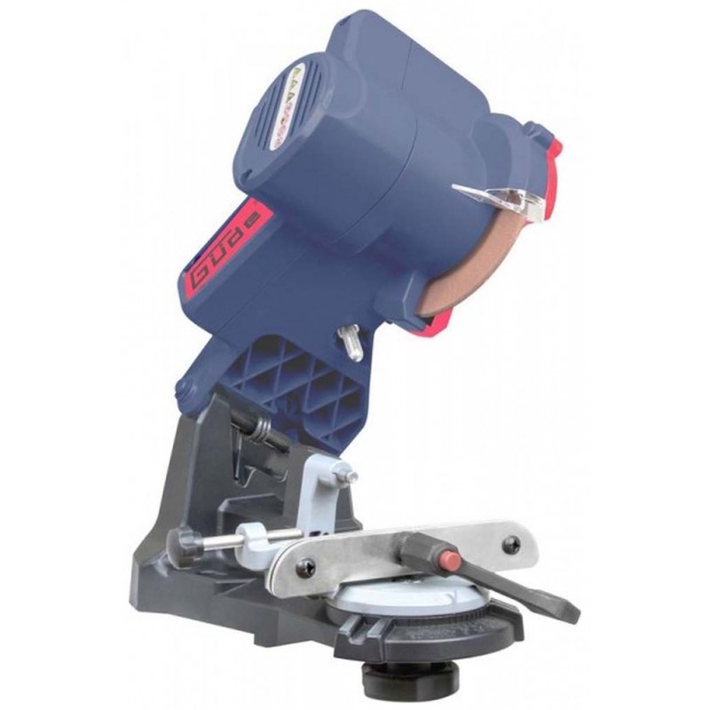 Konštrukcia: korpus ostričky z tvrdeného plastu, kryt kotúča s priehľadný clonou, skrutka pre nastavenie hĺbky brúsenie, reťazová zarážka, základová časť s otvormi (2) na montáž napevno.
