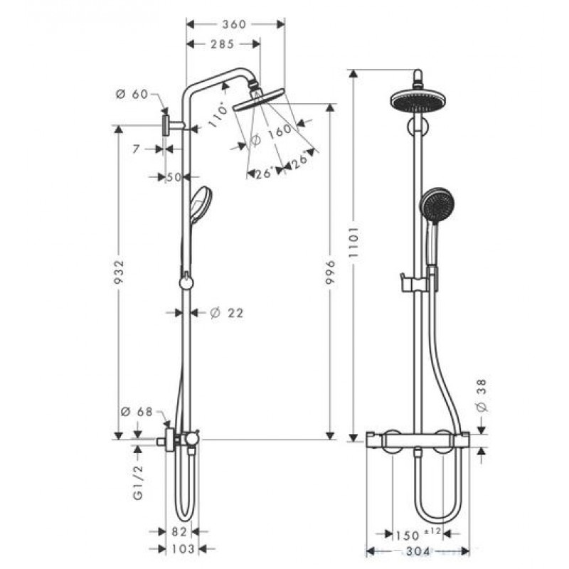 Popis výrobku Hansgrohe Croma 160 - Showerpipe 160 mm, sprchové rameno 270 mm, chróm 27135000:Hansgrohe Croma 160 27135 000