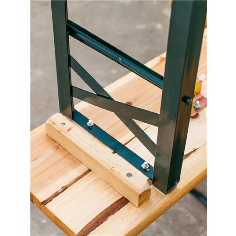 HAPPY GREEN Záhradný pivný set - 180cmZáhradný pivný set - 180cm, kovová konštrukcia v kombinácii s drevom, rozmery stola - 180x50x77cm (výška), 2x lavica - 180x25x46cm (výška), konštrukcia v tmavo zelenej farbe, drevo prírodné, hrúbka materiálu konštrukcia 0,25 cm, drevené laty ??2,7 cm , nosnosť lavíc 250kg, nosnosť stola 150kg.