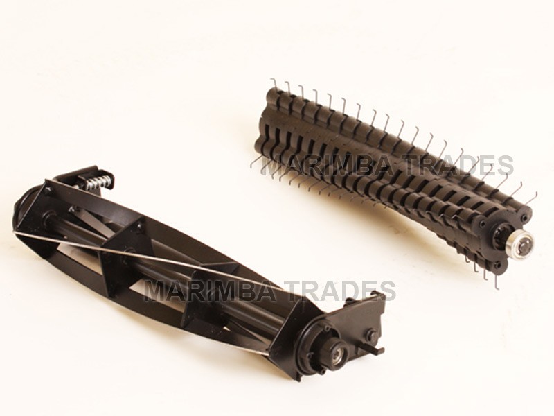 Elektrický prevzdušňovač trávnikov, plastové šasi, vybavený valcom s 22 oceľovými nožmi a súčasne valcom s oceľovými drôtmi.