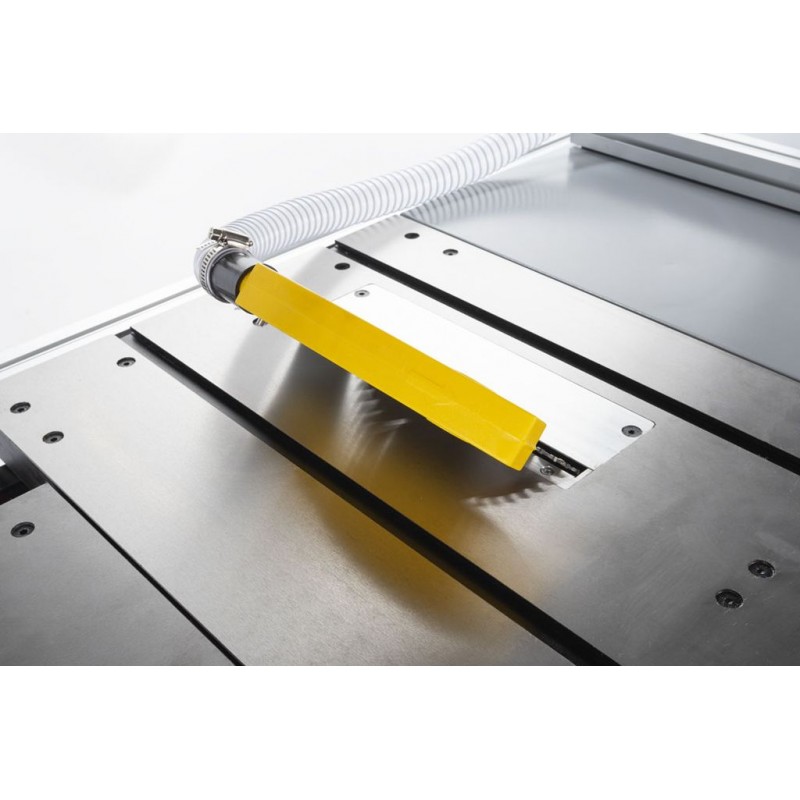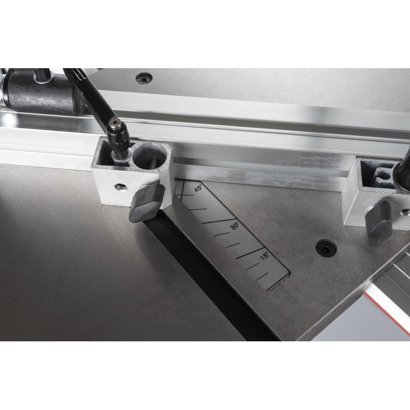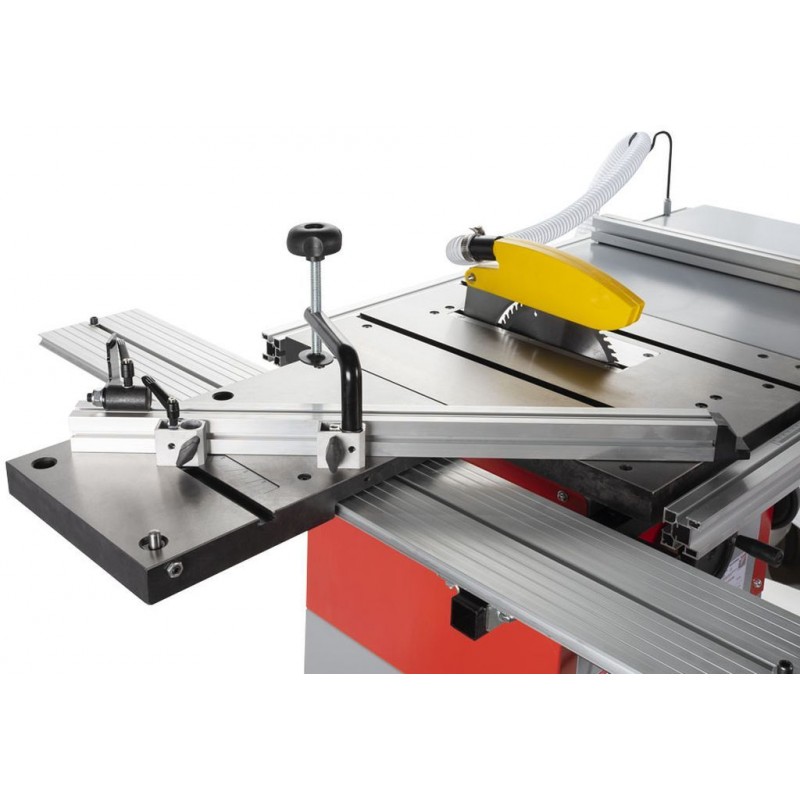 Píla je vybavená stabilným stolom z šedej liatiny vrátane predĺženia, čo zabezpečuje maximálnu presnosť a komfort pri práci aj s väčšími obrobkami. Manuálne nastavenie výšky a uhla kotúča (90°–45°) umožňuje flexibilné použitie pre pozdĺžne aj šikmé rezy. Samozrejmosťou je pozdĺžne aj priečne pravítko na presné vedenie materiálu.