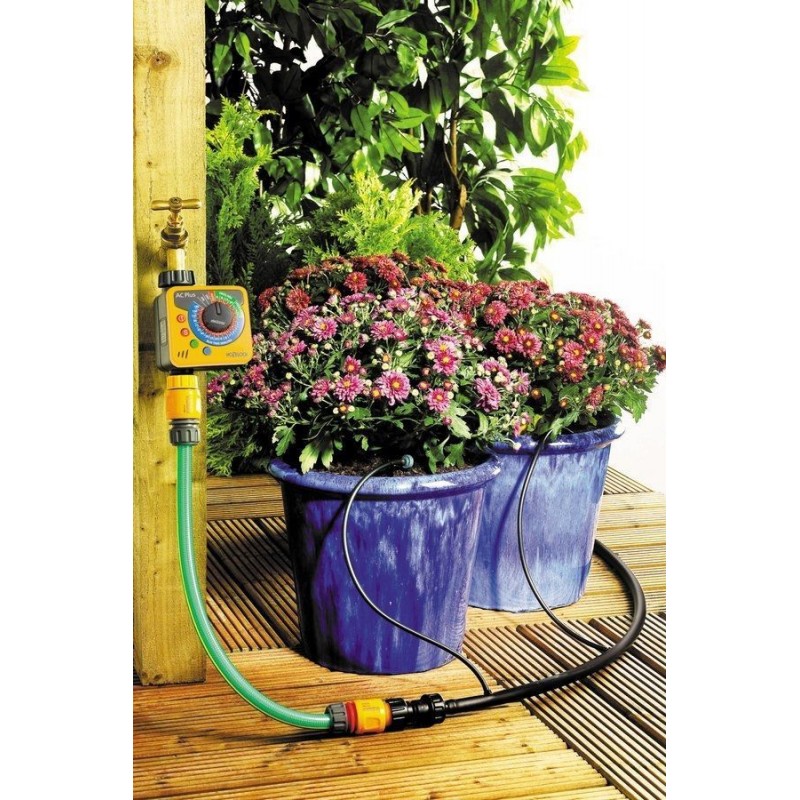 Kompletná sada pre automatické zalievanie živých plotov v dĺžke až 10m alebo 20 rastlín v kvetináčoch.Sada obsahuje počítač pre zalievanie AC Plus, redukciu tlaku, 15 mx 13mm hadice, 10 mx 4mm hadica, 5 x 4mm nástenné svorky a 10 x 4mm kolíky, 20 x odkvapkávačov a konektorov.