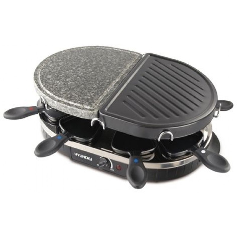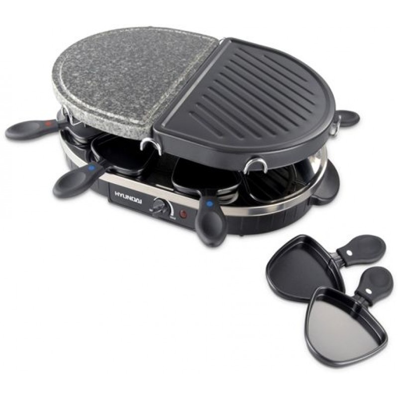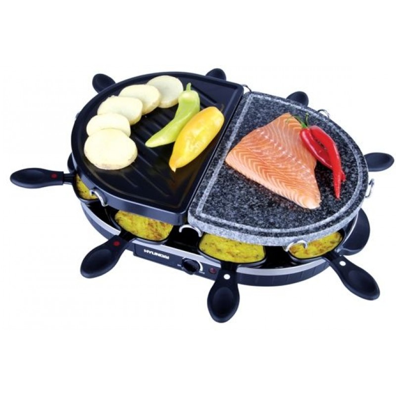 Raclette gril Hyundai je určený pre grilovanie a pečenie vďaka kombinácii raclette & kamenného grilu. Grilovacia platňa s nepriľnavým povrchom je odnímateľná a 8 panvičiek má tepelne izolovanú rukoväť. Nastavenie je jednoduché vďaka plynulo regulovateľnému termostatu so svetelnou kontrolkou a všetko je dobre umývateľné.