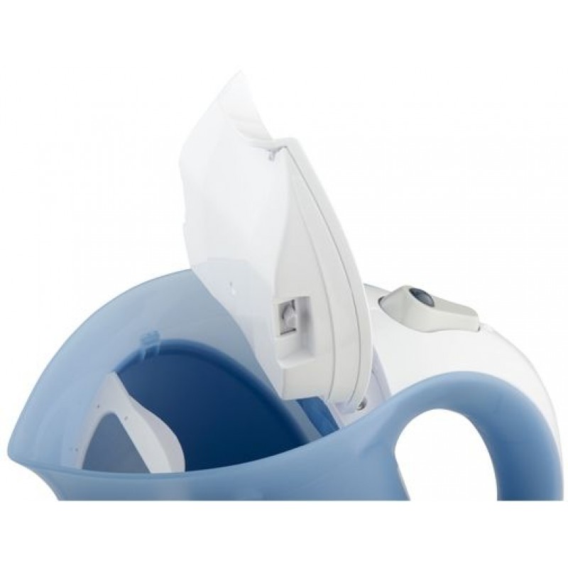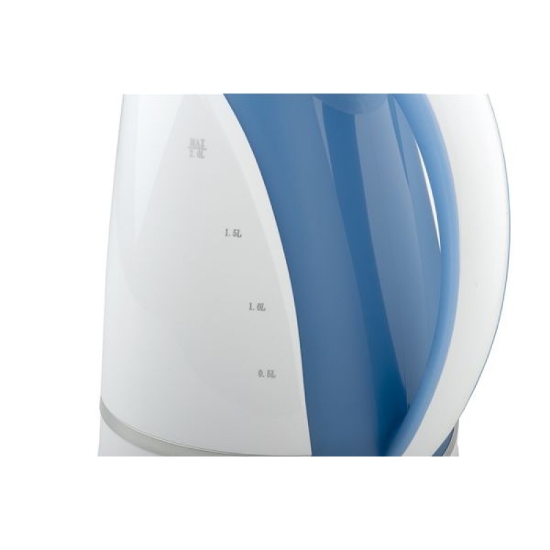 Bielo-modrá rýchlovarná kanvica s objemom 2 l so skrytým výhrevným telesom, plochým nerezovým dnom, 360 ° konektorom a umývateľným filtrom proti usadeninám.