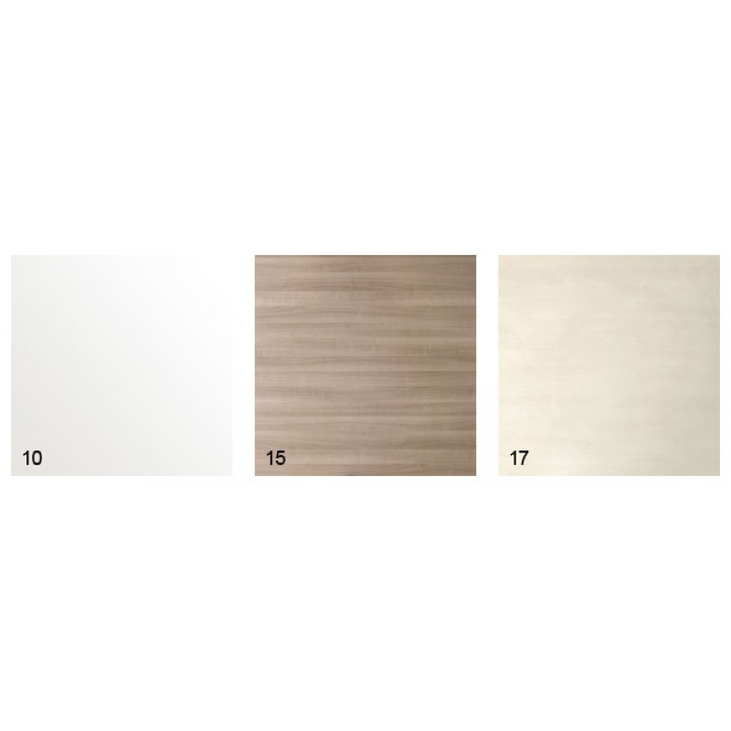 Čelné plochy (dvierka, krycie dosky, rampy a police zrkadiel) a korpusy sú z 18mm lamina vo vysokom bielom lesku alebo v dvoch drevodekoroch. Hrany nábytku sú olepené PUR lepidlom pre nadštandardnú ochranu proti vlhkosti. Dvierka opatrená tlmeným dovieraním.