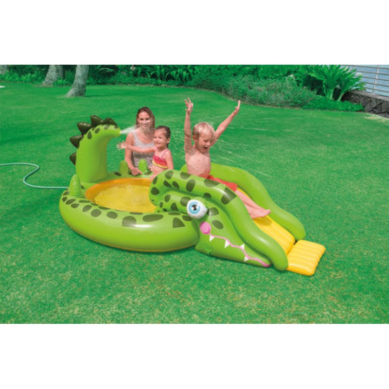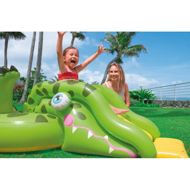 INTEX Gator Centrum hier 157132NPOriginálny bazén v tvare krokodíla s vodnou šmýkačkou. Bazén s rozmerom 251 x 140 x 86 cm disponuje extra širokými stenami a výpustným ventilom. Hrúbka steny predstavuje 0,30 mm pri vodnej šmýkačke a 0,25 pri bazéne. Integrovanú rozprašovaciu funkciu je možné riadiť pripojením záhradnej hadice. Pri výške naplnenia 16 cm predstavuje objem vody 110 l. Od 2 rokov.
