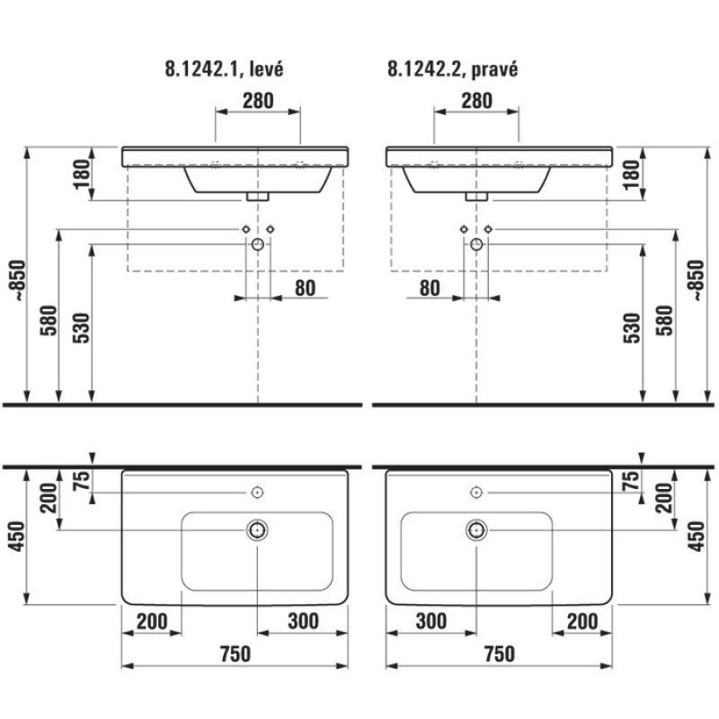 Jika CUBITO Asymetrické umývadielko 75 cm, s otvorom pre batériu, ĽAVÉ, bielas otvorom pre batériu uprostred