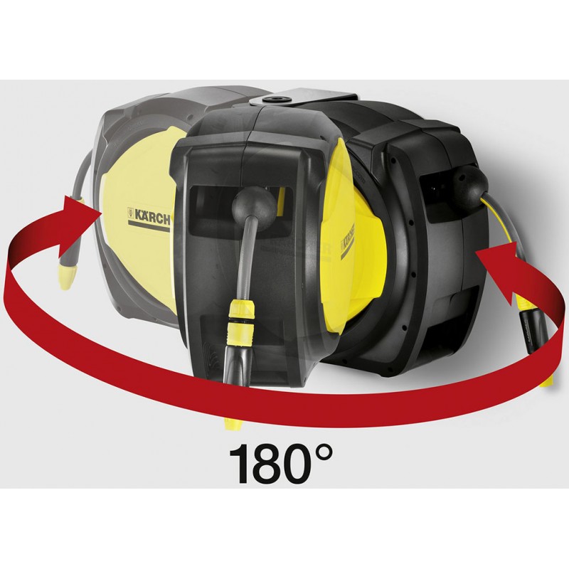 Hadicový box CR 7.220 Automatic radu Premium s automatickým navíjaním ako aj odvíjaním hadice s ľahkým chodom. Otočný od 0° – 180°, nastaviteľná zarážka natáčania predchádza poškodeniu stien a predmetov vedľa boxu. Plochý nástenný držiak šetrí miesto. Zmontovaný, vrátane hadice.