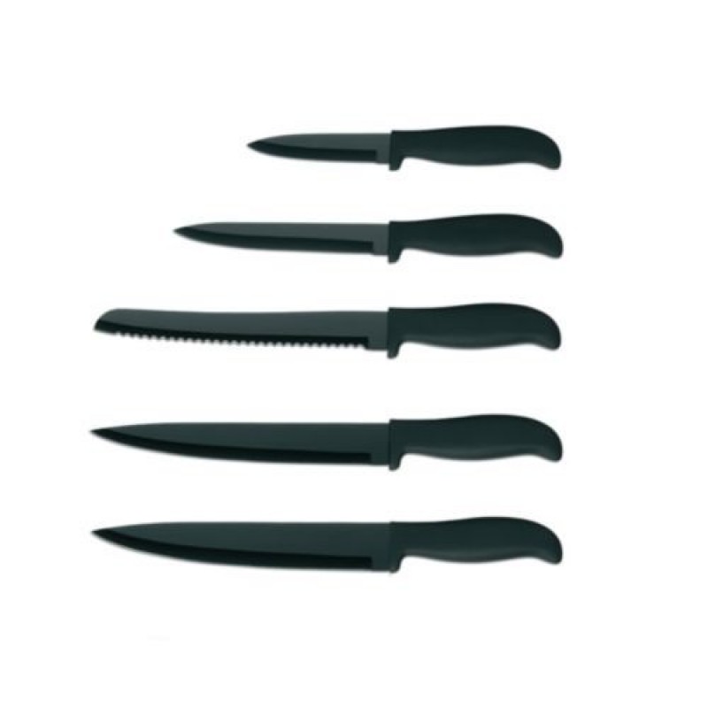 KELA Sada kuchynských nožov 5 ks v stojane Acid šedá KL-11288Vysoko kvalitné nože z ocele v čiernej farbe v stojane z PP plastu sivej farby. Praktický vnútro je tvorený tenkými plastovými tyčami, ktoré umožňujú ľubovoľné umiestnenie nožov a zabraňujú poškriabaniu ostrie.