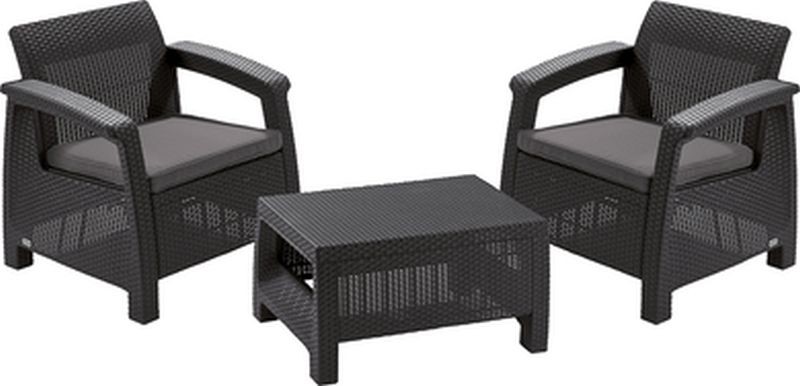 KETER BAHAMAS WEEKEND Set záhradný, ratan, grafit/sivá 17205922BAHAMAS je záhradný set v atraktívnom ratanovom štýle. Skladá sa zo stolíka a dvoch kresiel. Jednoduchá montáž a bezúdržbové prevedenie. Vyrobené z odolného materiálu s neblednúcimi farbami. Zostava odoláva poveternostným podmienkam a výkyvom počasia. Dodávané vrátane sedadla. Čistenie mäkkou handričkou vlažnou vodou so saponátom.