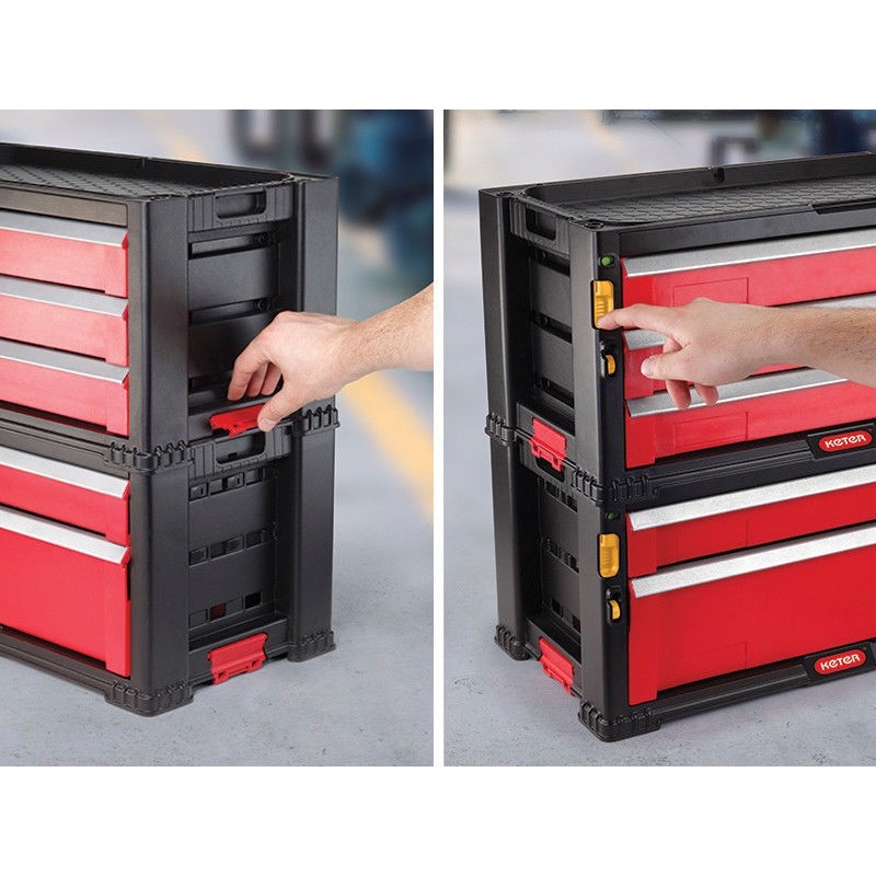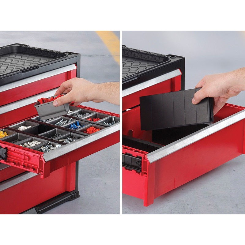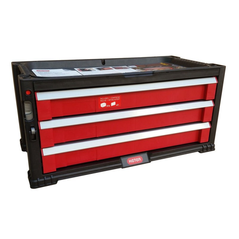 KETER Box na náradie, 3 zásuvky, 56,2 x 28,9 x 26,2 cm, červená / sivá / čierna, 17199302Masívne úložný box z pevného a odolného plastu s tromi zhodne veľkými zásuvkami. Zásuvky sú ešte rozdelené na menšie priehradky použiteľné na spojovací materiál a iné drobnosti. Box je stohovateľný, možno kombinovať s boxom č. 17199303. Ideálne do garáží alebo dielní.