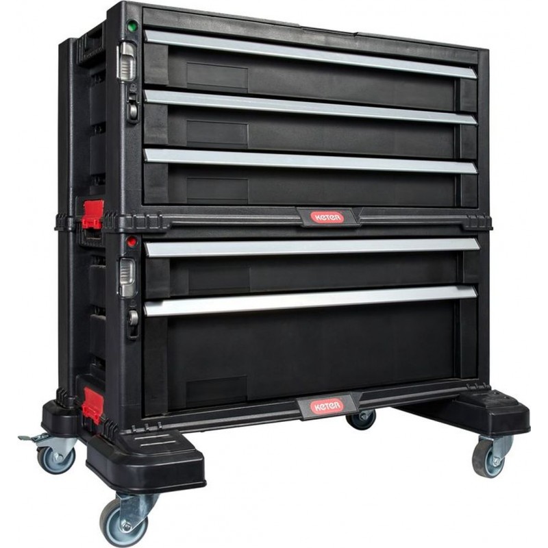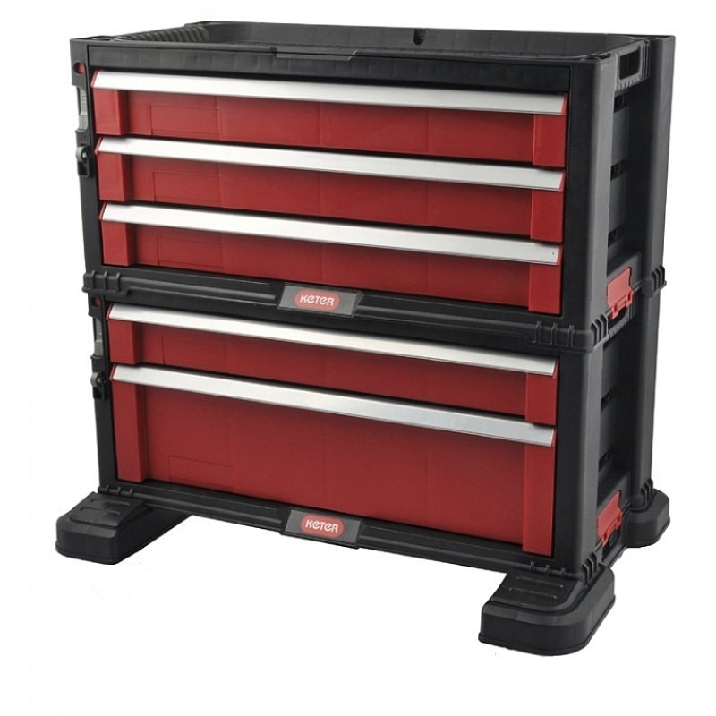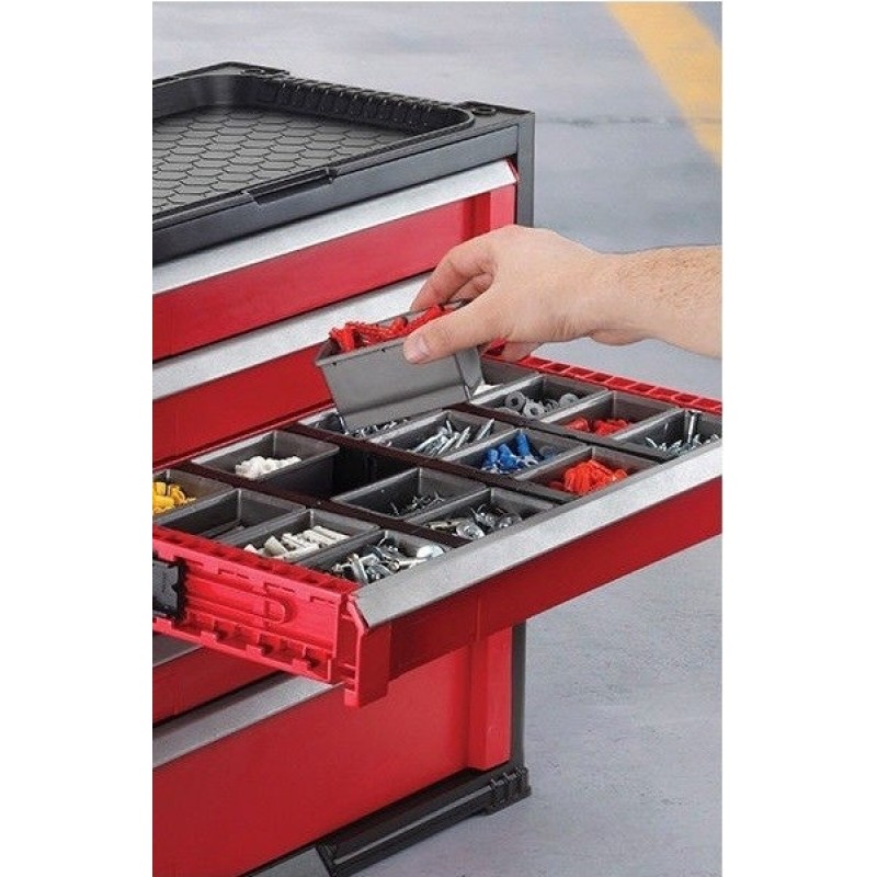 Keter Regál na náradie 5 zásuviekPraktický úložný box na náradie je vhodný pre uloženie všetkých potrebných vecí a náradia v dielni, či v garáži. Box poskytuje dostatok priestoru pre všetko náradie a príslušenstvo. Obsahuje 1 hlbokú zásuvku s odnímateľnými priehradkami pre väčšiu náradie a 4 ďalšie zásuvky vhodné pre uloženie menších druhov náradia a príslušenstva. Ďalej obsahuje 16 praktických vyberateľných malých boxov pre prehľadné uloženie spojovacieho materiálu alebo roztriedenie drobnejších vecí a pre lepšiu orientáciu vo vnútri šuplíkov. Box je stohovateľný a dá sa kombinovať s boxom na náradie - 3 zásuvky 17199302 a 2 zásuvky 17199303.