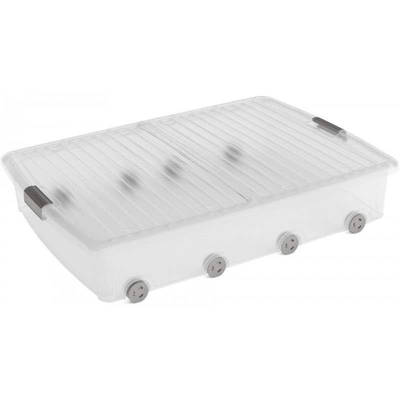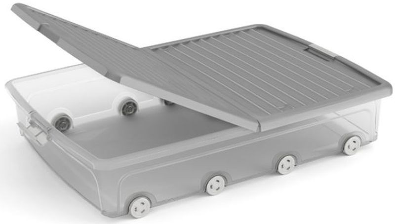 KIS W BOX UNDERBED XL 55L 79x58x16,5cm transparent/svetlo siváNízky plastový box s vekom na kolieskach je ideálny pre umiestnenie pod posteľ a využitie všetkého úložného priestoru. Môžete ho použiť na hračky, oblečenie, drobné predmety a mnoho ďalšieho. Priehľadné vyhotovenie, 8x plastové koliesko zabudované do dna, delené veko umožňujúca ľahkú manipuláciu s obsahom, pevné zaistenie veka postrannými klipy. Sú v ňom vylisovanej priehlbiny na kolieska pre ukladanie boxov na seba.