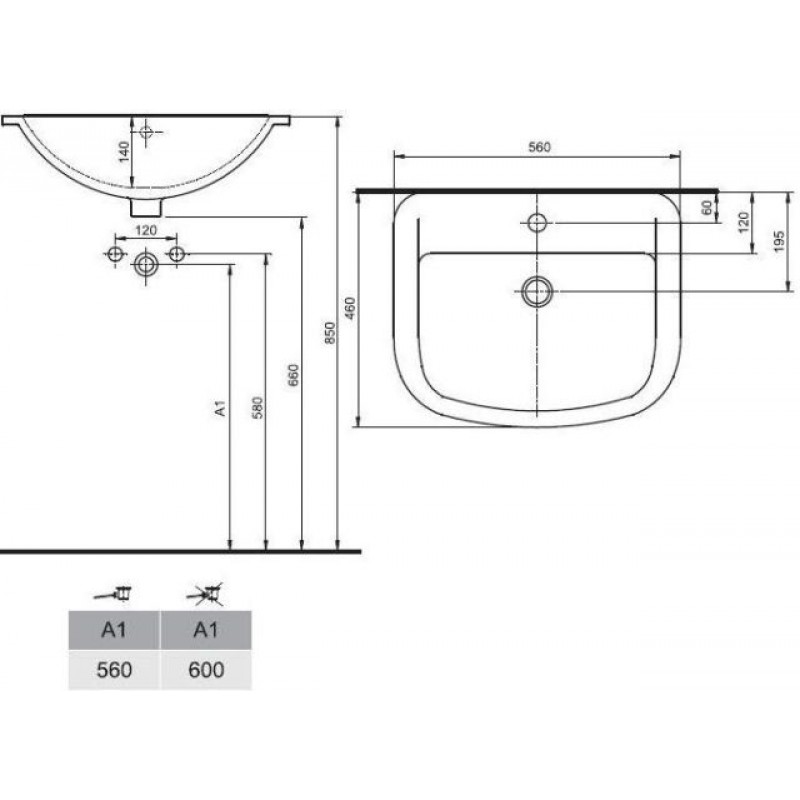 KOLO Primo umývadlo zápustné 56 cm, s otvorom pre batériu, s prepadom K81656- S otvorom pre batériu