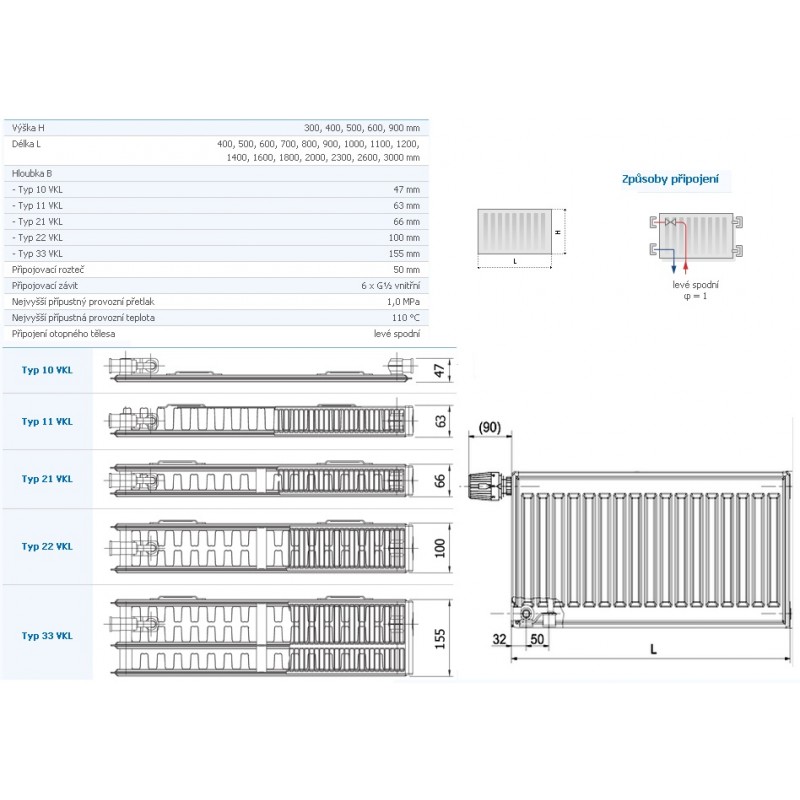 KORADO doskový radiátor typ VKL 33 600/1100 33-060110-E0-10Model RADIK VKL je doskové vykurovacie teleso v prevedení VENTIL KOMPAKT, ktoré umožňuje ľavé spodné pripojenie na vykurovaciu sústavu s núteným obehom. Zo zadnej strany sú privarené dve horné a dolné príchytky, radiátory o dĺžke 1800 mm a dlhšie majú navarené šesť príchytiek
