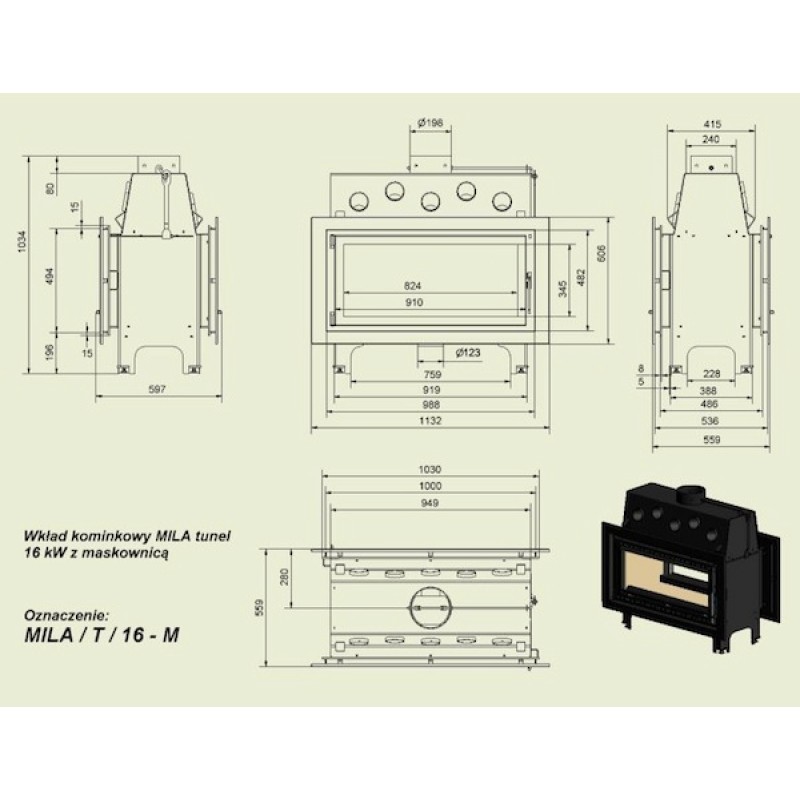 KRATKI MILA/T 16 kW krbová vložka teplovzdušná, priehľadové skloNominálny výkon: 16 kW