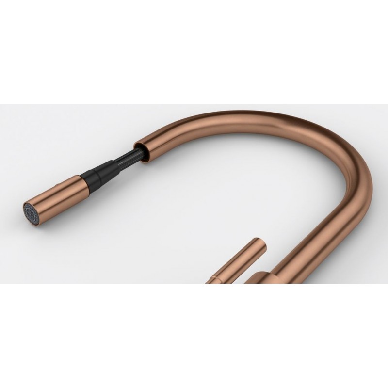 Otočná 360°. S vyťahovacou koncovkou osadenou perlátorom. S reguláciou Sprcha/Prúd. Opletená sprchová hadica 170 cm. Pripojenie Hadičky 55 cm. Prietok vody 7,74 l/min. (3 bar). Laminárny prietok vody. Nie je vhodná pre montáž do nerezových drezov.