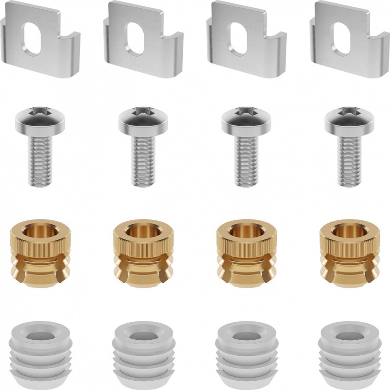 - Balenie: 4× príchytka, 4× skrutka, 4× mosadzná matica, 4× plastová matica.